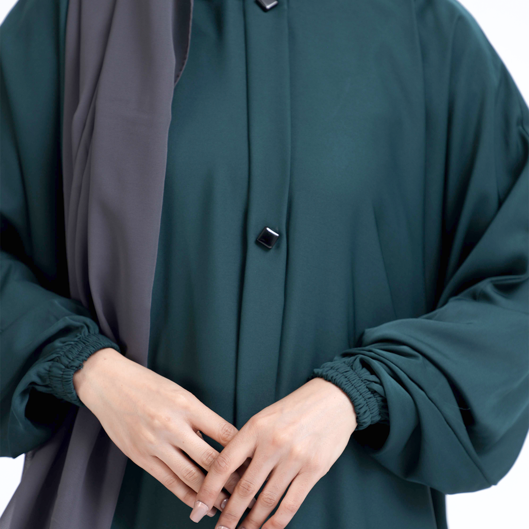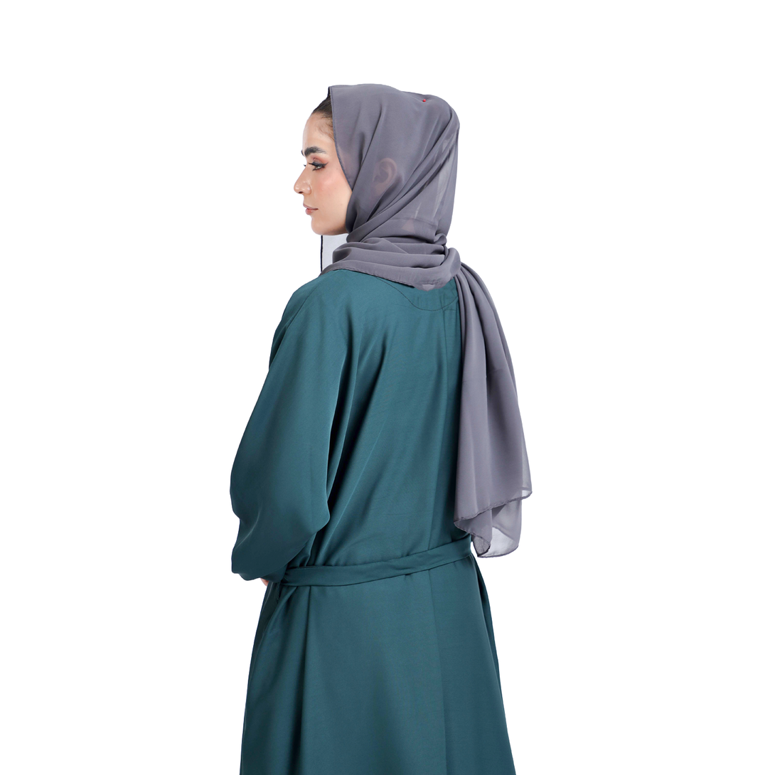 Hoorain_The Mirhas Teal Blue Stones Casual Elegant Abaya introduces a breath of fresh color to your modest wardrobe with its captivating ocean-inspired hue. Adorned with delicate stone accents that shimmer subtly, this teal beauty offers the rare combination of relaxed wearability and eye-catching sophistication.