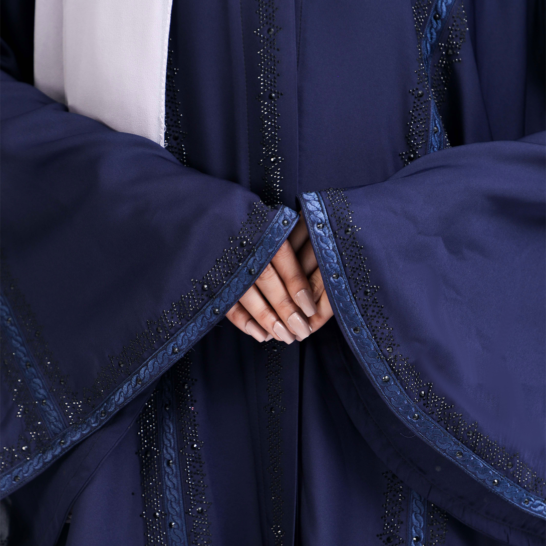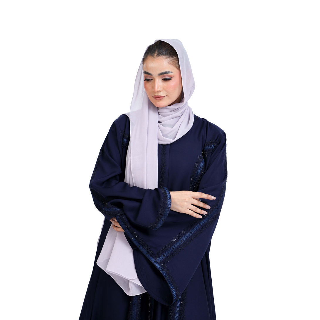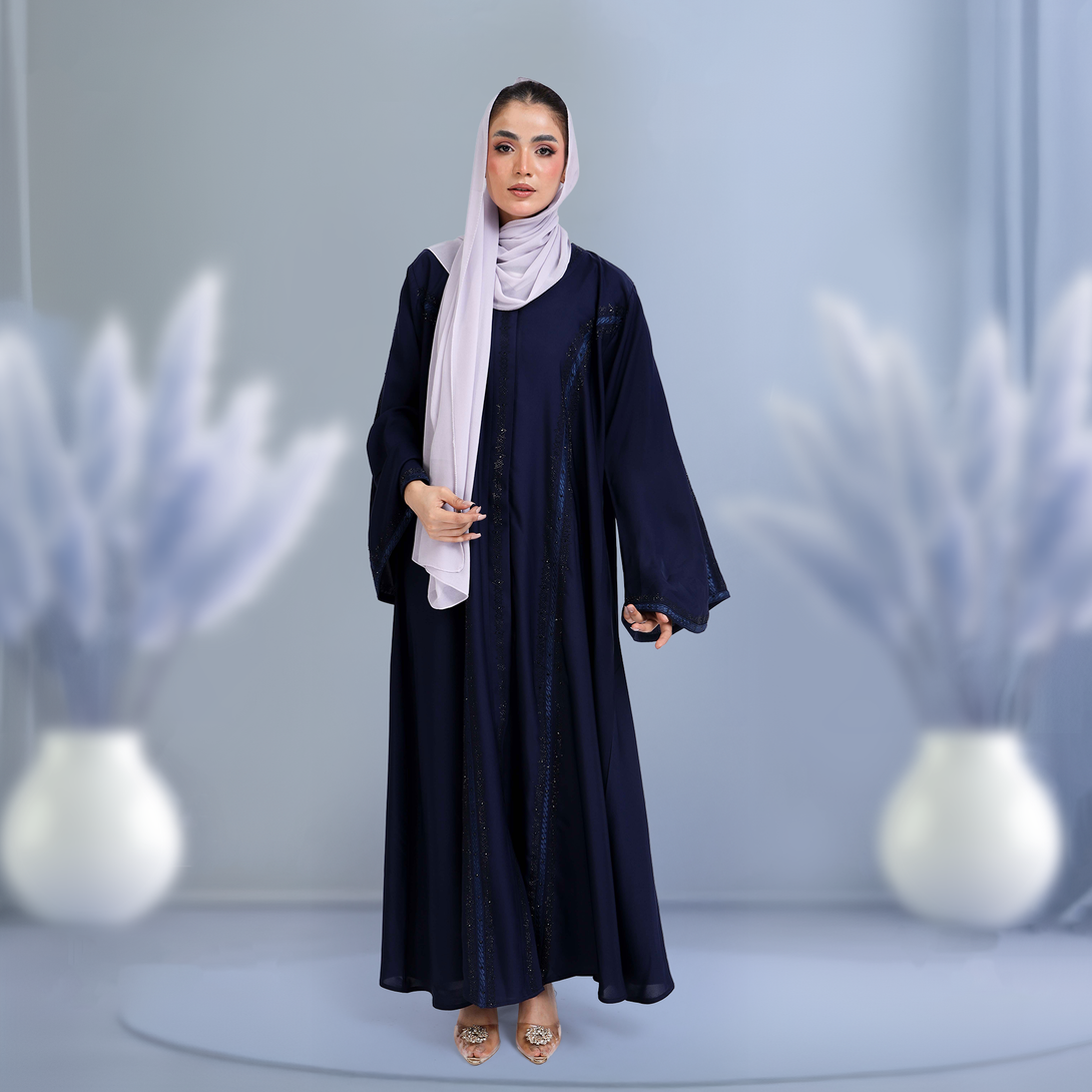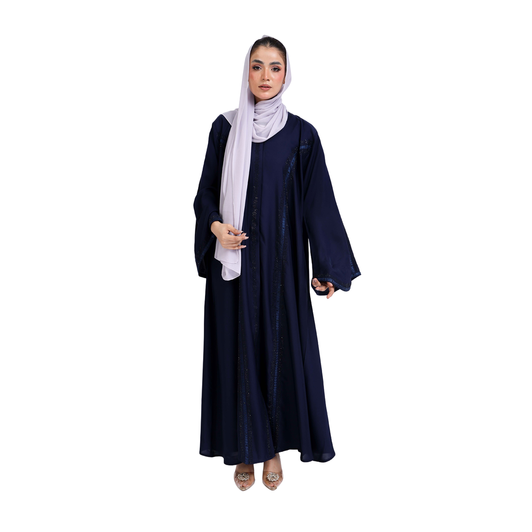 Nayla_The Mirhas Midnight Blue Embellished Elegant Abaya offers that perfect alternative when black feels too safe but you still want timeless elegance. This stunning midnight blue captures light beautifully and looks incredibly flattering on every skin tone you can imagine.