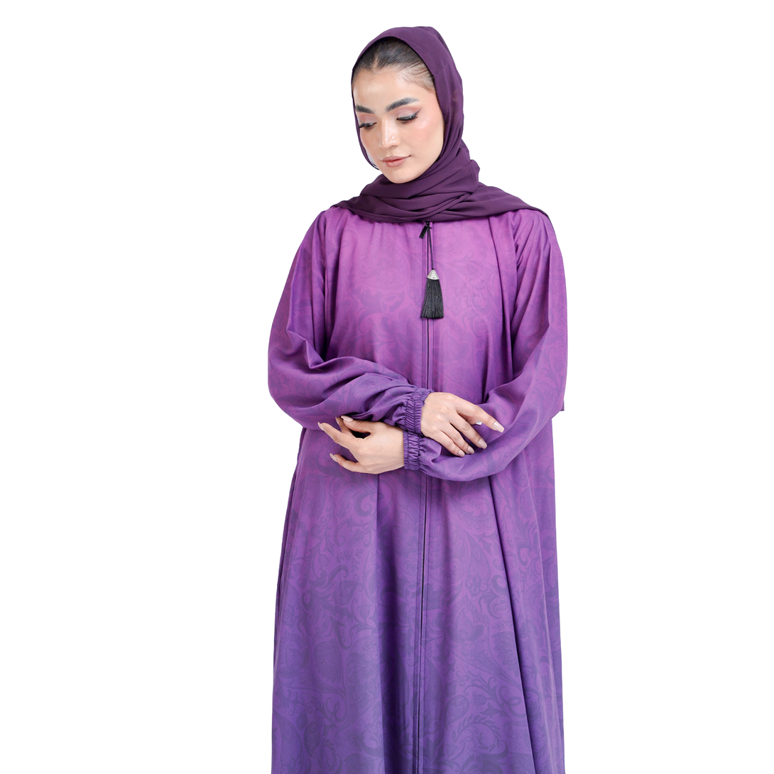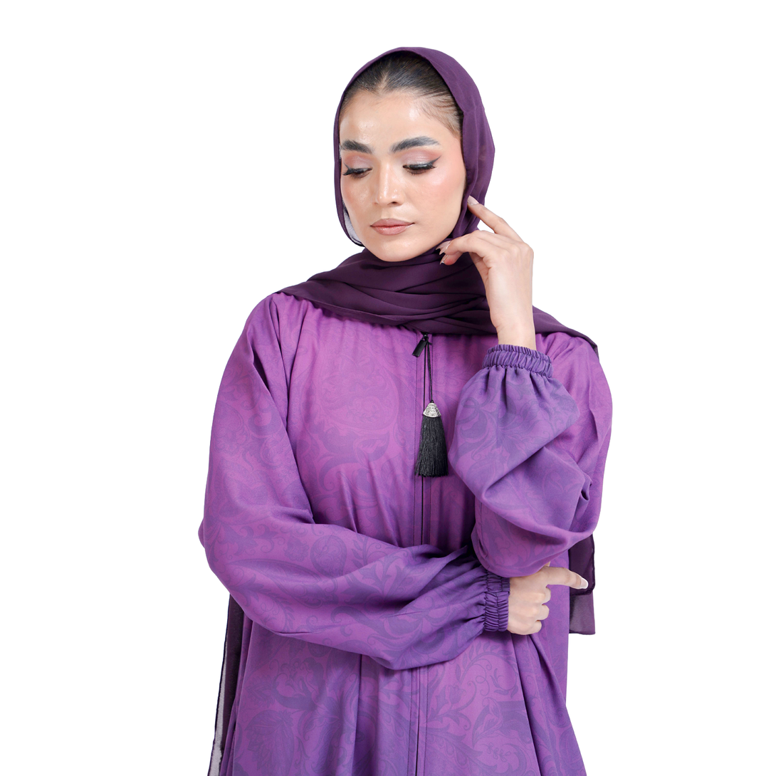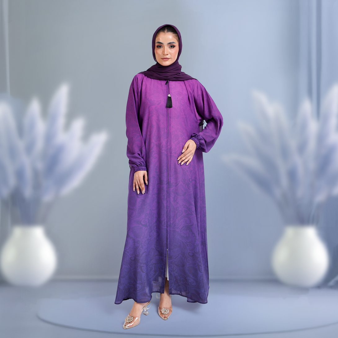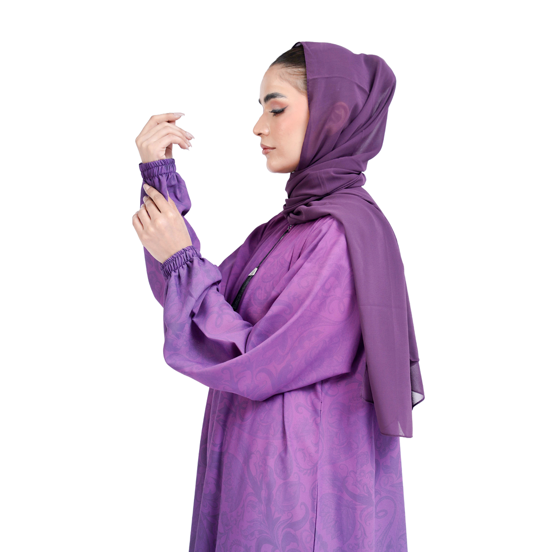 Alya_The Mirhas Purple Mist Front Zip Georgette Elegant Abaya combines soft, dreamy color with practical everyday convenience. That gorgeous purple mist shade is gentle on the eyes and works beautifully whether you're dressing up or keeping things casual and comfortable.