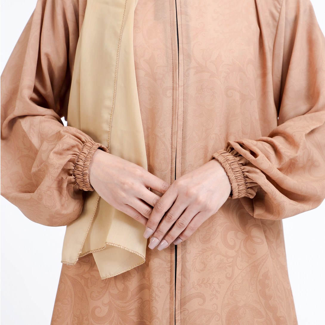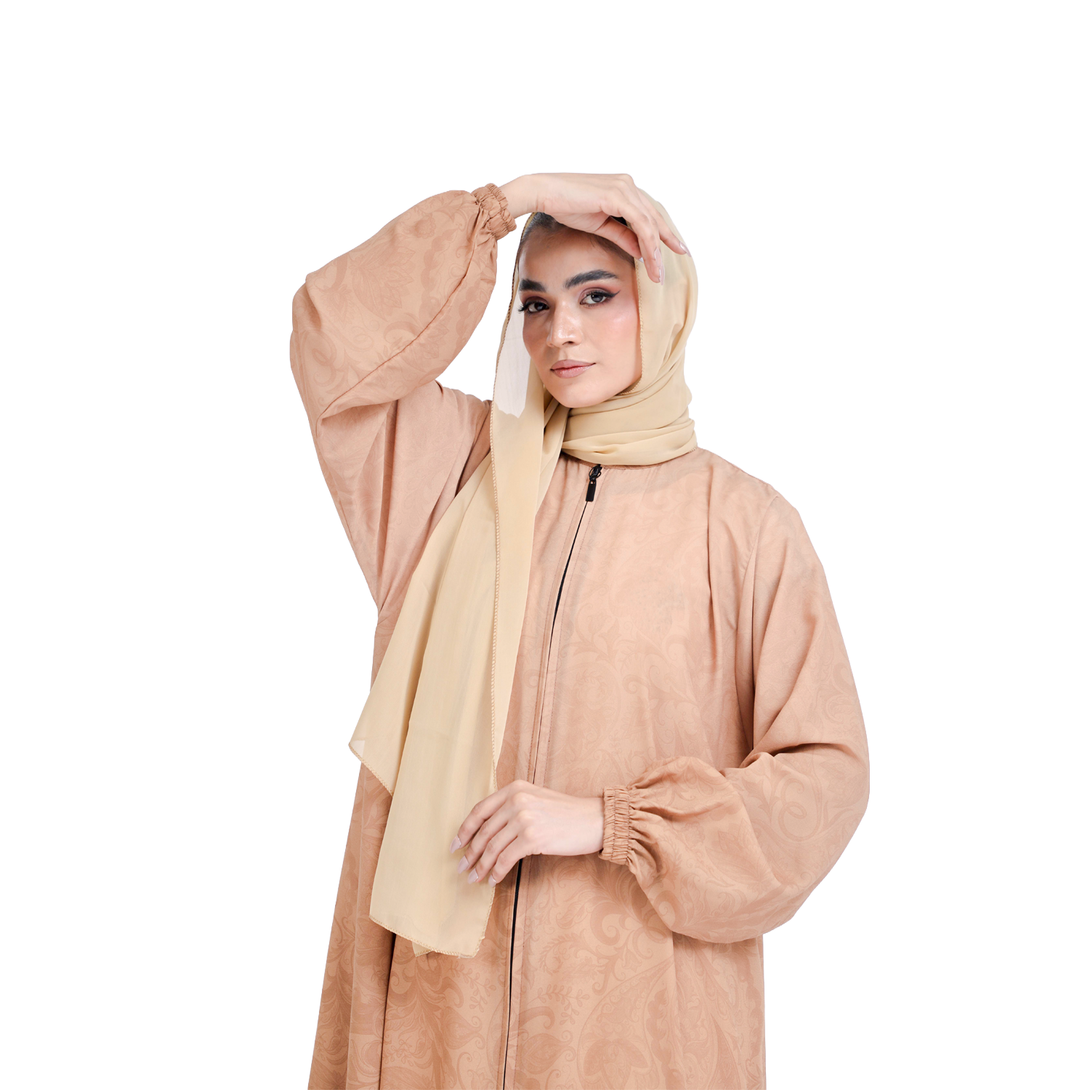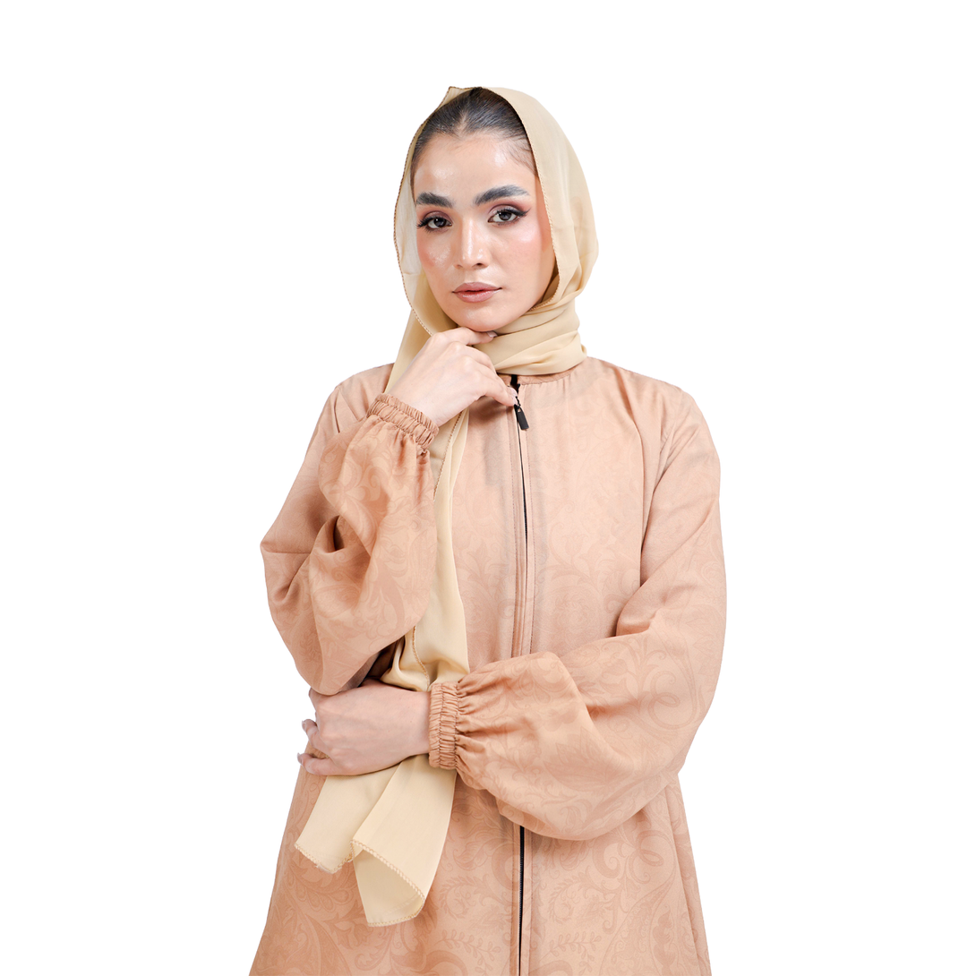 Mahra_The Mirhas Peach Blush Front Zip Embellished Elegant Abaya delivers soft, feminine charm with a touch of sparkle that makes you smile. This gorgeous peach blush shade is warm and inviting, giving you that radiant glow without needing any extra effort.