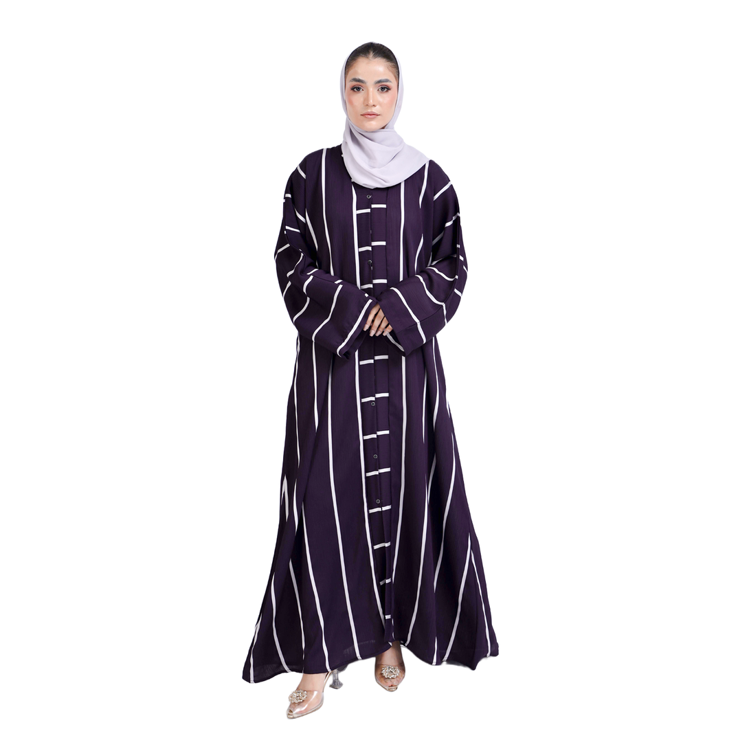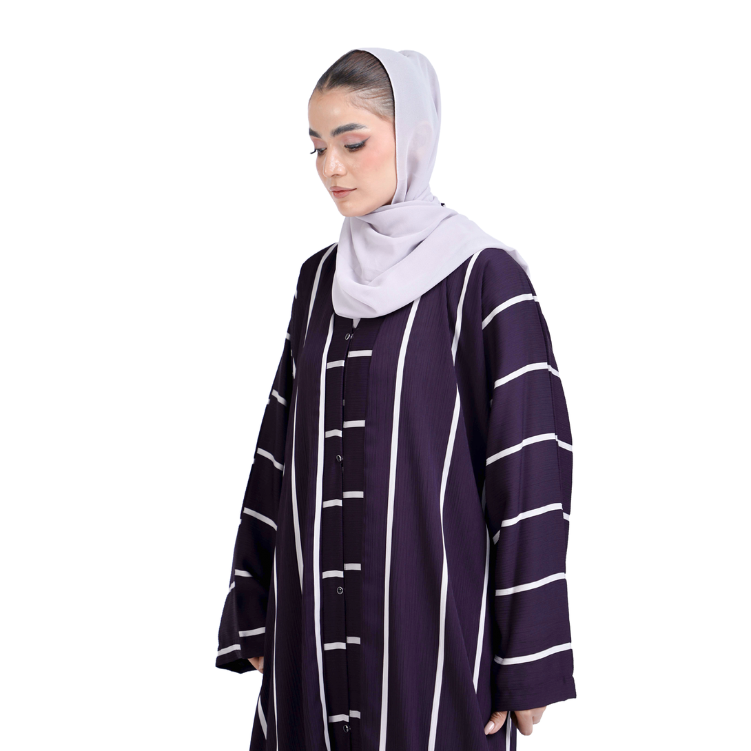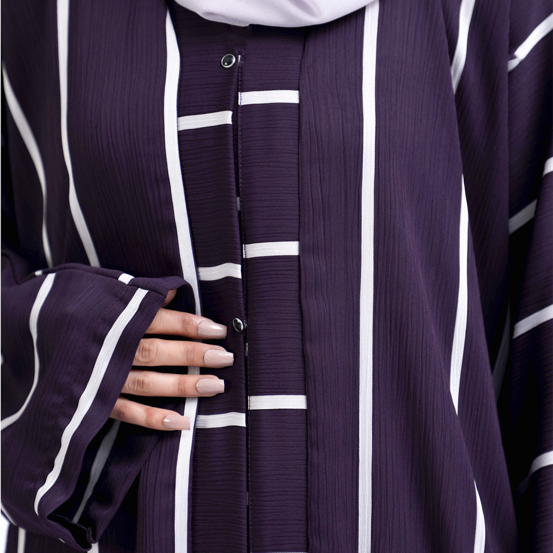 Rania_The Mirhas Dark Purple With White Lining Decent Abaya offers unexpected sophistication through its striking color contrast. The deep purple exterior paired with crisp white lining creates visual interest that peeks through subtly as you move throughout your day.