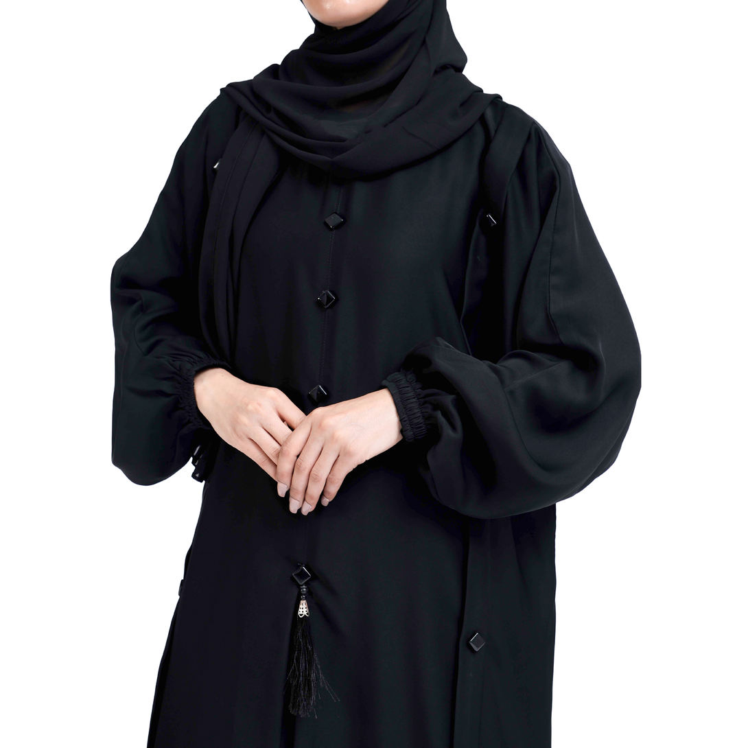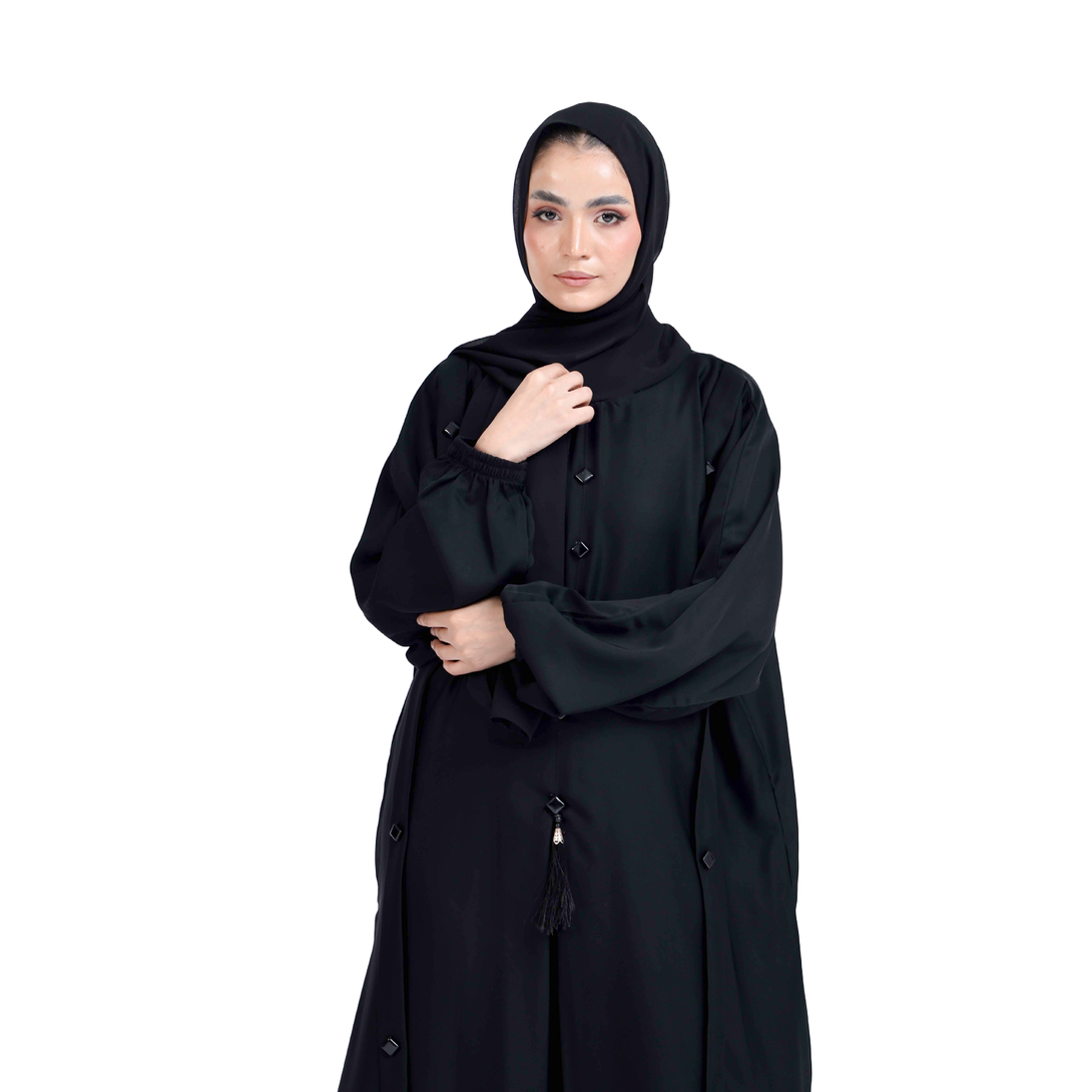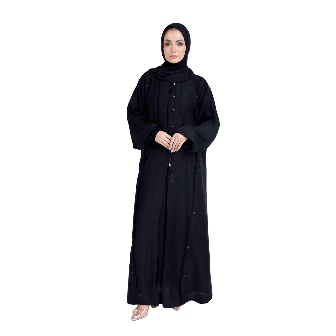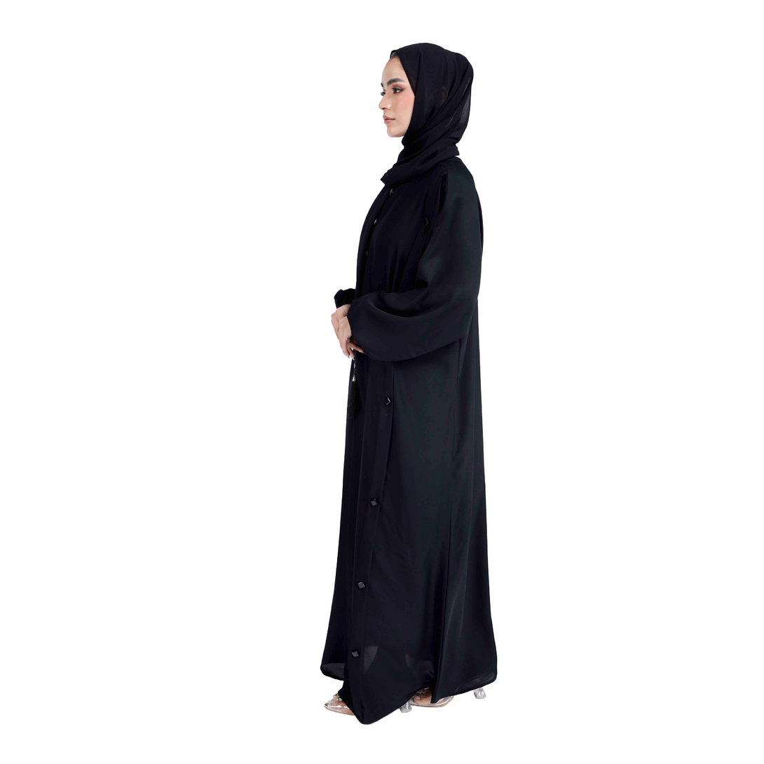 Sahar_The Mirhas Charcoal Black Stones Premium Abaya offers understated luxury through its sophisticated charcoal tone and subtle stone detailing. This isn't your typical harsh black—the charcoal shade has depth and dimension that looks incredibly refined in any lighting.